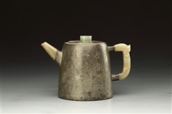 清 程石泉制、朱石楳刻 三镶玉权形锡包壶 无锡博物院藏通长13.5cm 腹宽6.3cm 高9.8cm此壶紫砂胎,外包锡,故名锡包壶,为清代嘉道年间程石泉与朱石楳合作精品。壶体为权形,圆柱状,上窄下宽,流短而直,方形环把,平底。盖顶嵌扁柱形玉...