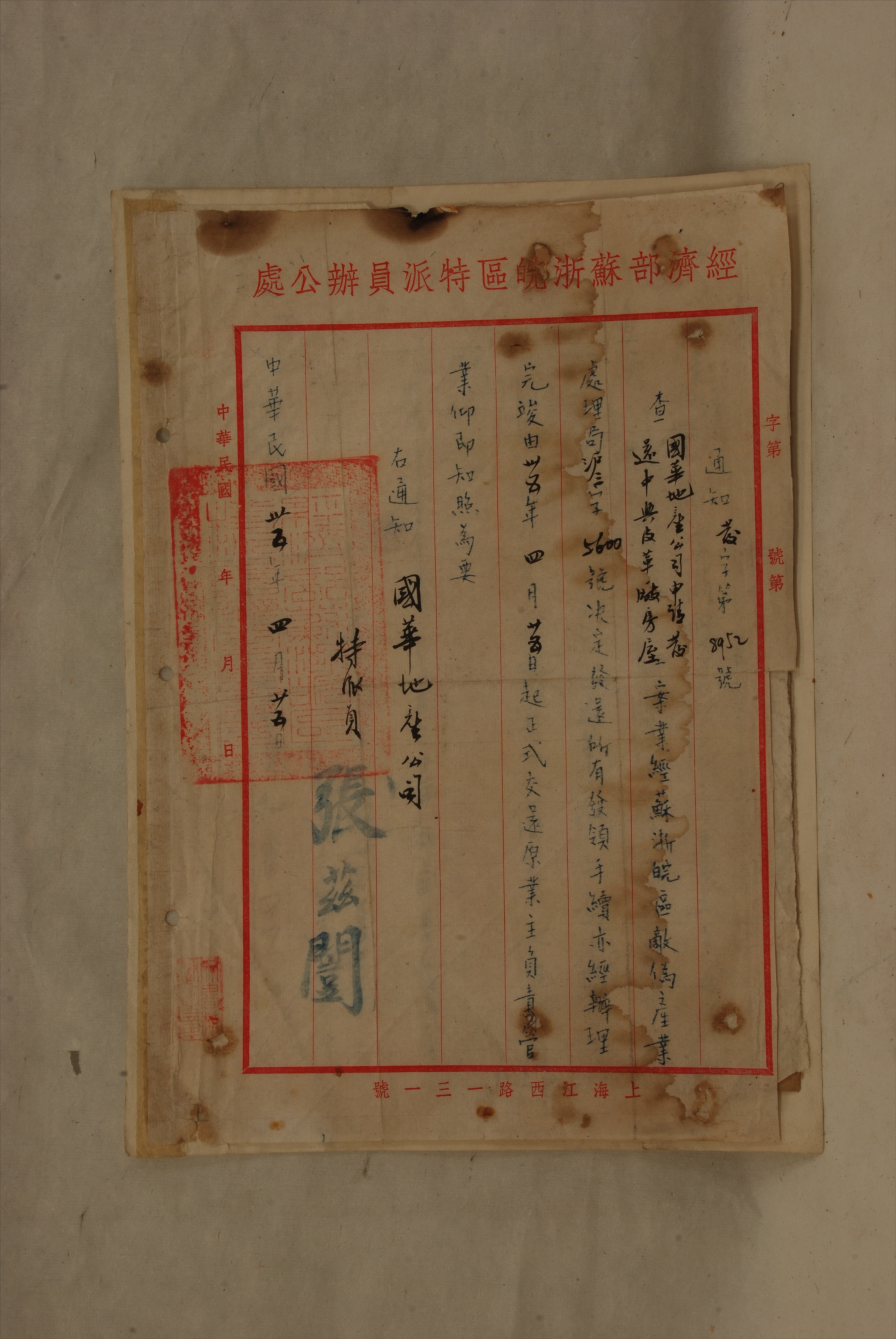 1946年4月25日经济部苏浙皖区特派员办公处给国华地产公司的通知