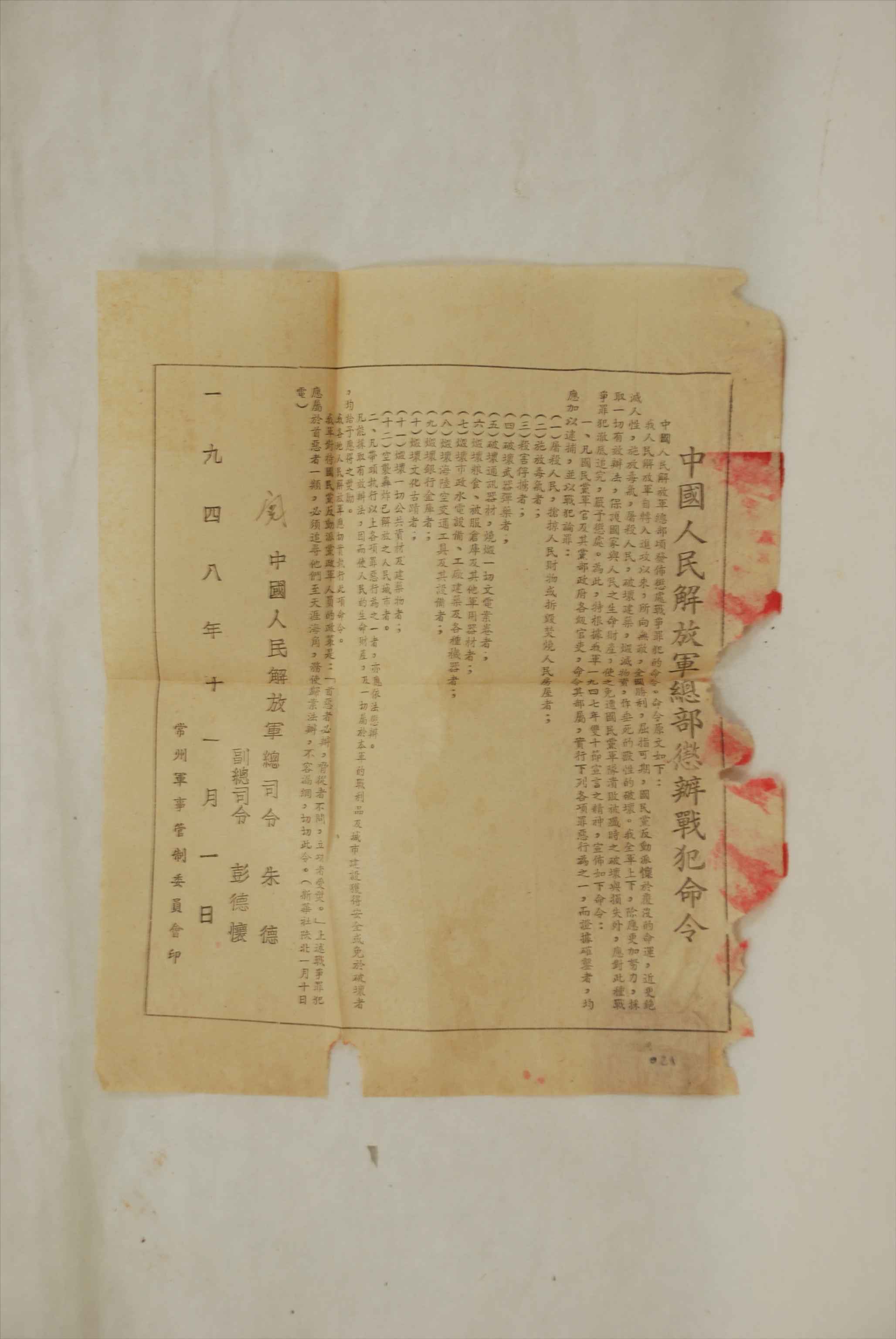 1948年11月1日常州军事管制委员会印发的《中国人民解放军总部惩办战犯命令》