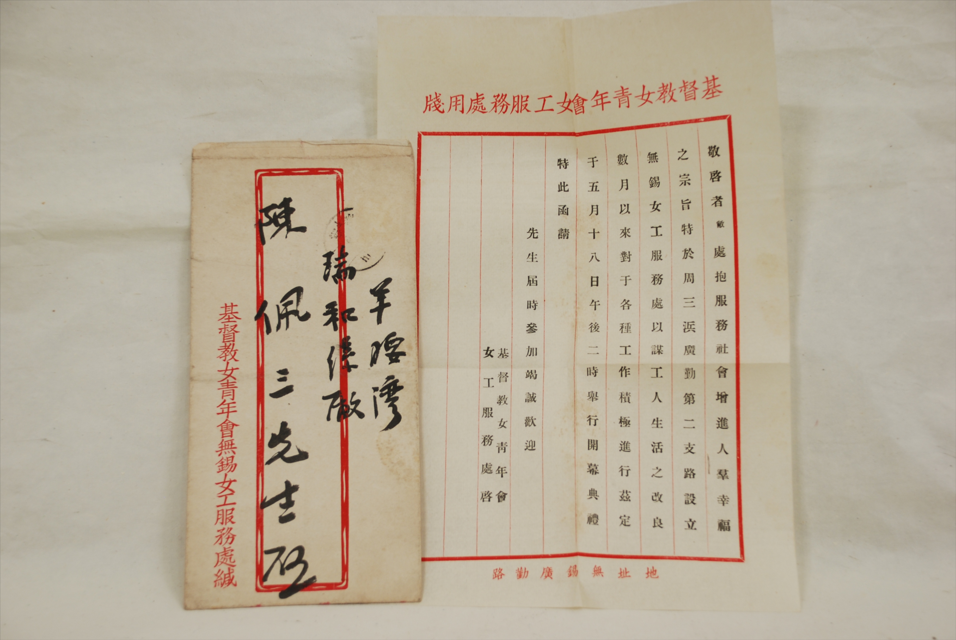 民国基督教女青年会无锡女工服务处给陈佩三的信
