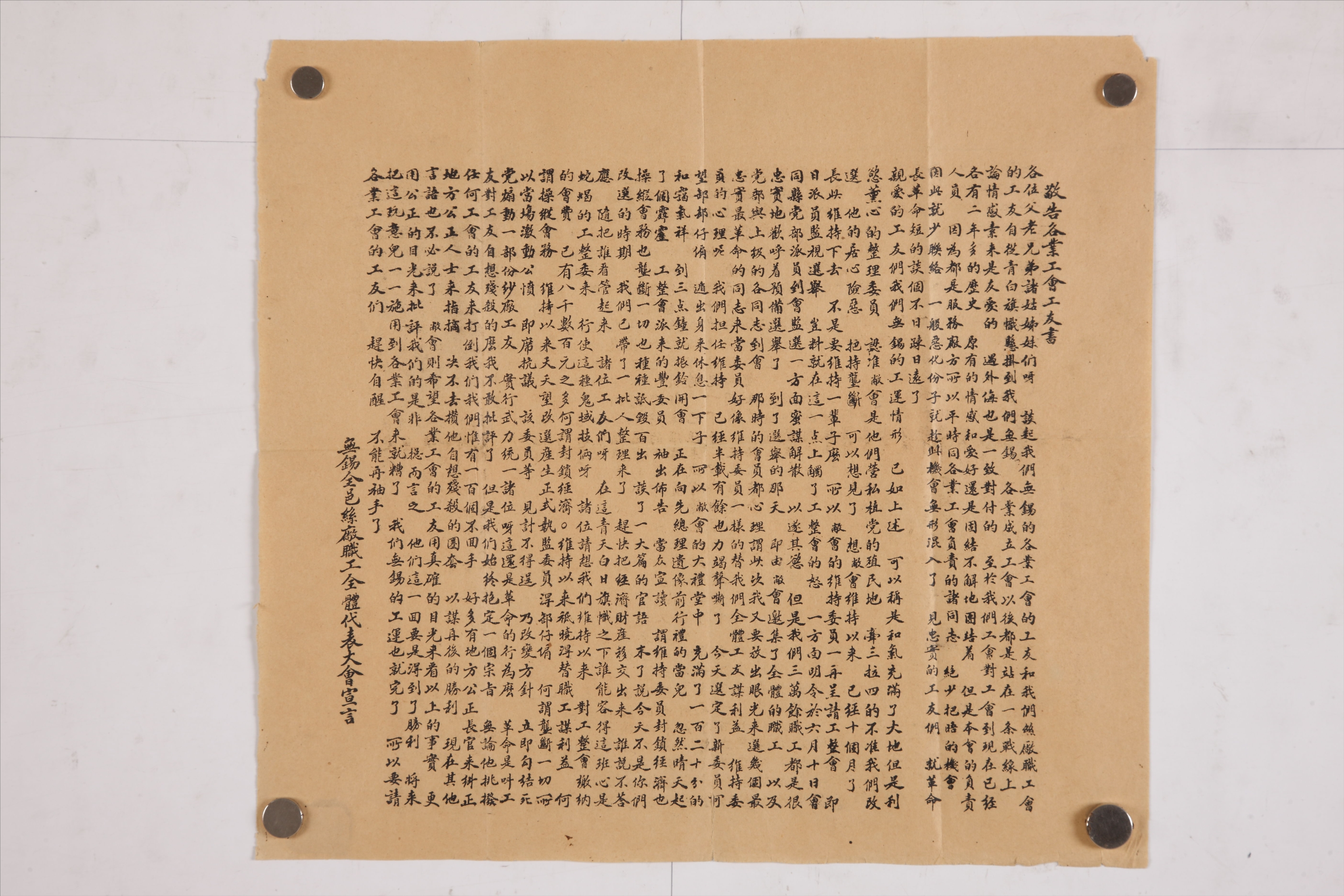 民国无锡全邑丝厂职工全体代表大会宣言(敬告各业工会工友书)