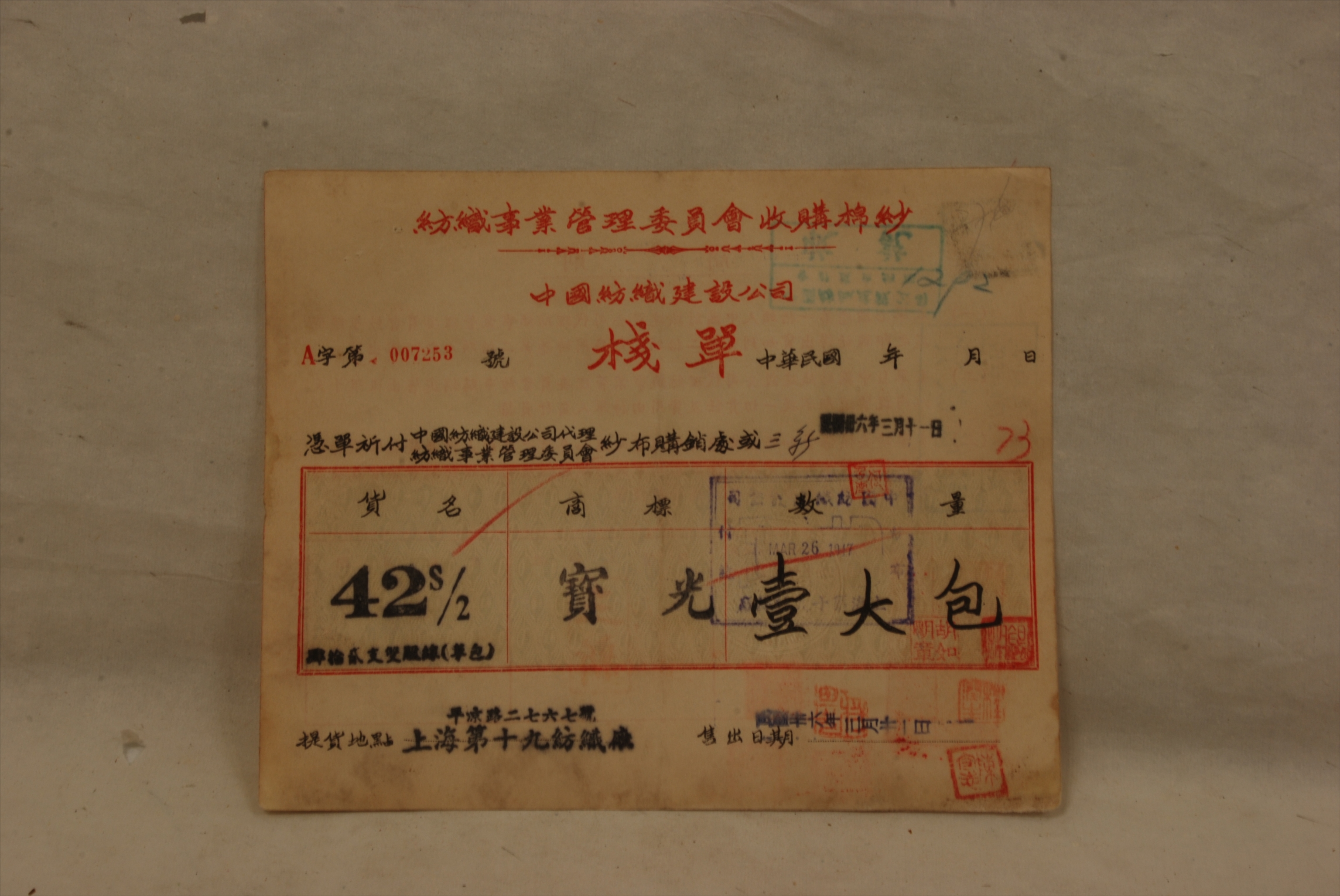 1947年3月11日中国纺织建设公司栈单