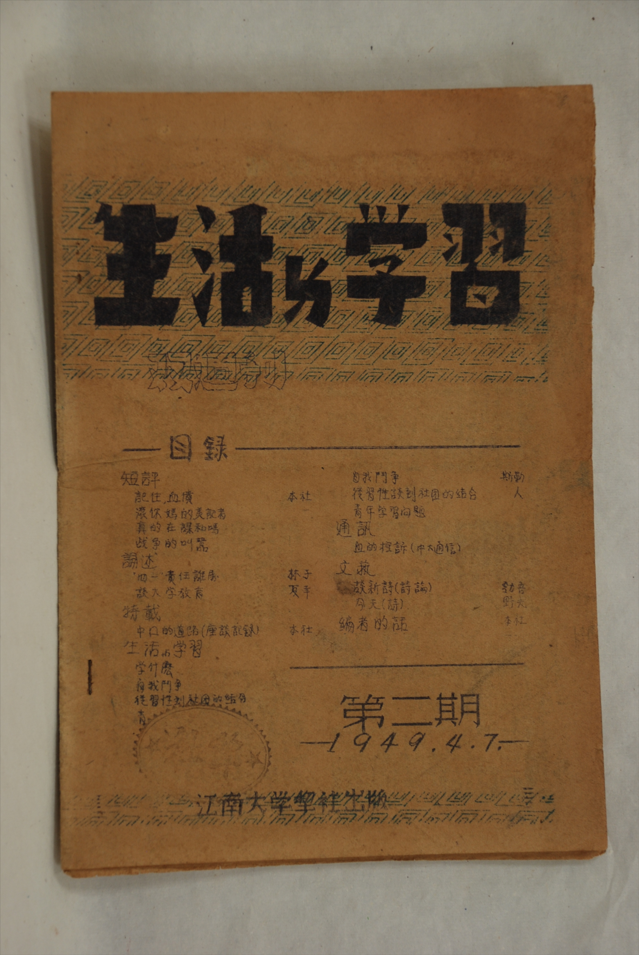 1949年4月7日江南大学犁社出版的《生活与学习》第二期