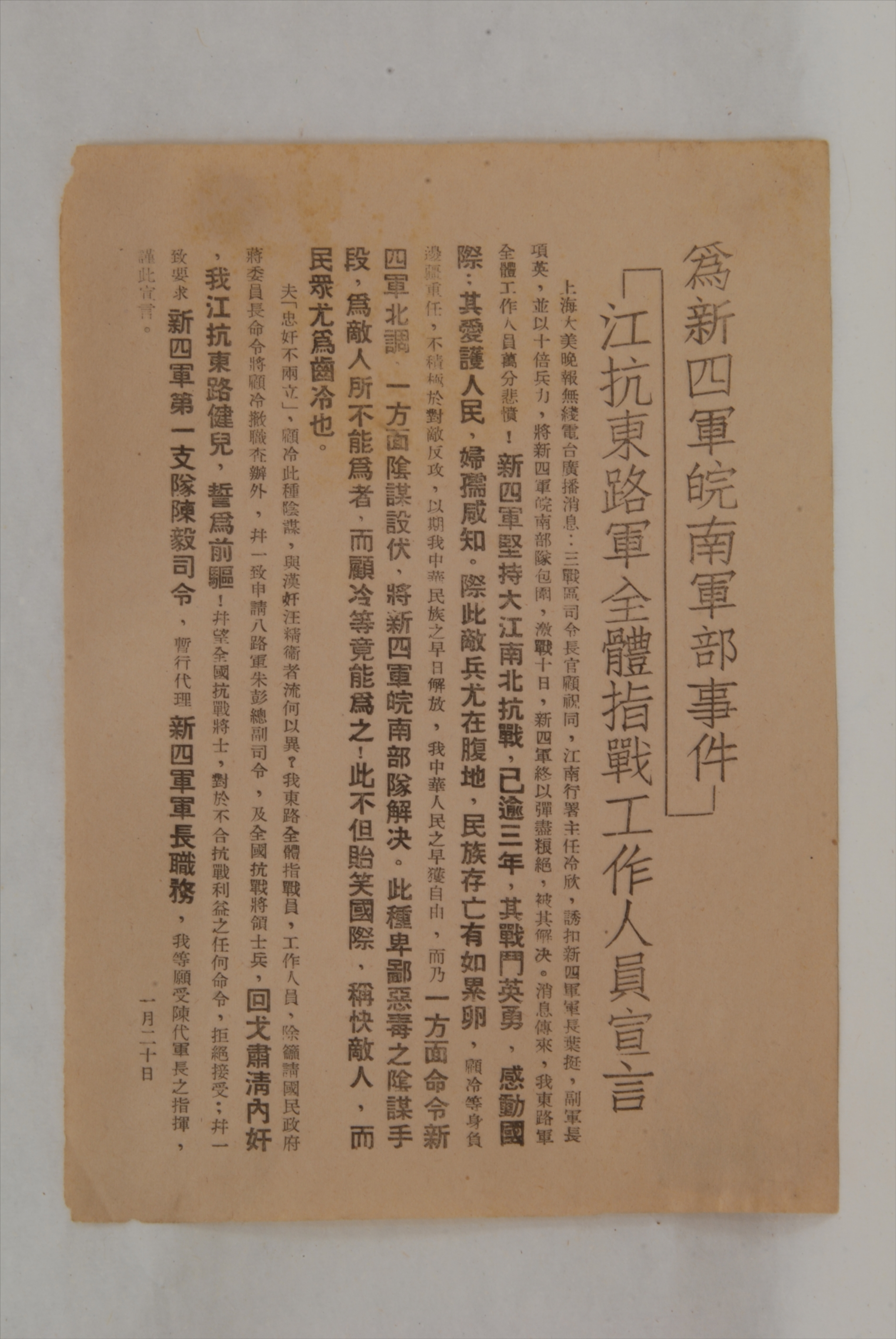 1941年1月20日《为新四军皖南军部事件江抗东路军全体指战工作人员宣言》